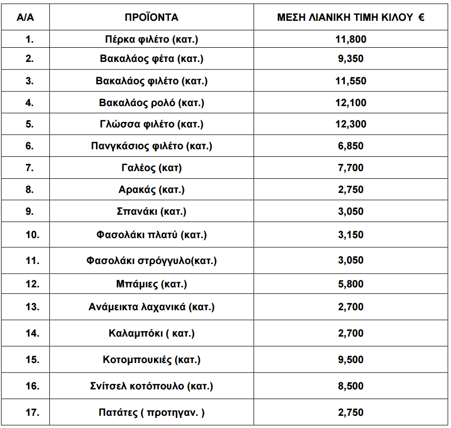 Οι διαμορφωθείσες μέσες λιανικές τιμές κατά τον μήνα Δεκέμβριο 2025 στα παρακάτω αναγραφόμενα είδη που προσφέρονται στις προμήθειες του Δημοσίου, Νοσηλευτικών Ιδρυμάτων και Ν.Π.Δ.Δ., χωροταξικής αρμοδιότητας της Π.Ε. Γρεβενών έχουν ως εξής: