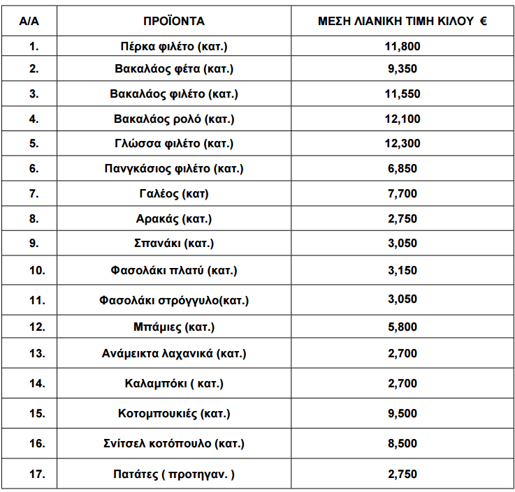 Οι διαμορφωθείσες μέσες λιανικές τιμές κατά τον μήνα Ιούνιο 2025 στα παρακάτω αναγραφόμενα είδη που προσφέρονται στις προμήθειες του Δημοσίου, Νοσηλευτικών Ιδρυμάτων και Ν.Π.Δ.Δ., χωροταξικής αρμοδιότητας της Π.Ε. Γρεβενών έχουν ως εξής: