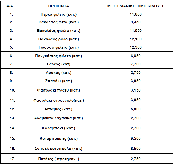 Οι διαμορφωθείσες μέσες λιανικές τιμές κατά τον μήνα Μάρτιο 2025 στα παρακάτω αναγραφόμενα είδη που προσφέρονται στις προμήθειες του Δημοσίου, Νοσηλευτικών Ιδρυμάτων και Ν.Π.Δ.Δ., χωροταξικής αρμοδιότητας της Π.Ε. Γρεβενών έχουν ως εξής: