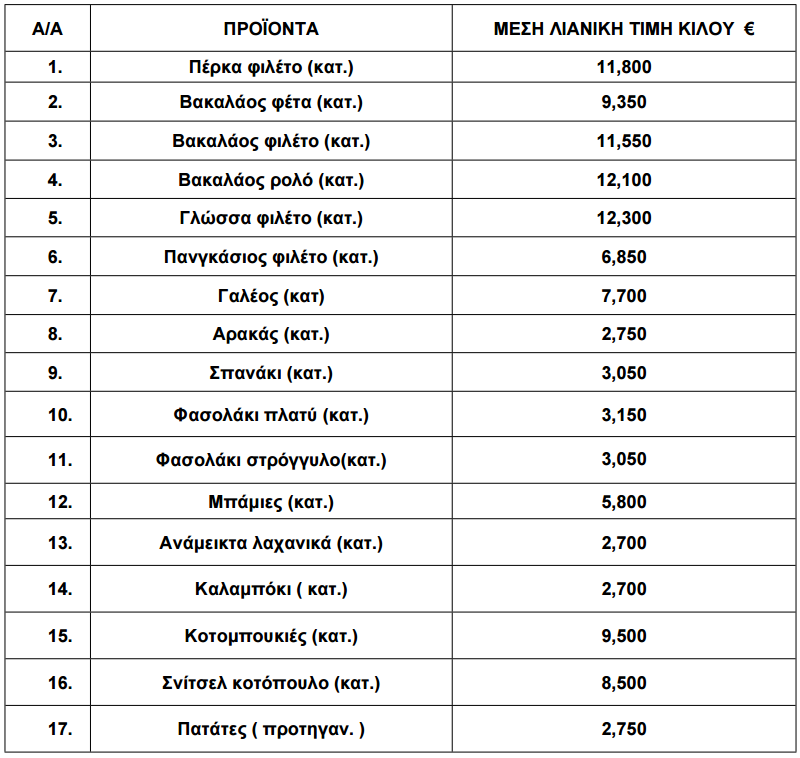 Πίνακας με τις τιμές κατεψυγμένων προϊόντων για τον Νοέμβριο 2025(Οι αναγραφόμενες Λιανικές Τιμές εμπεριέχουν και το Φ.Π.Α).